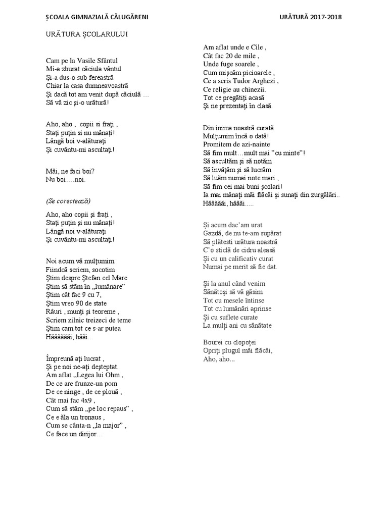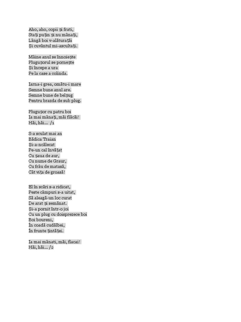 Aho aho copii și frați stați puțin și nu mânați lângă boi v alăturați kilometrii de autostradă să i numărați. Aho aho copii și frați stați puțin și nu mânați. S a sculat mai an bădica traian și a încălecat pe un cal învățat cu numele de graur cu șeaua de aur cu frâu de mătasă cât vita de groasă. 21 decembrie 2017 10 57.
