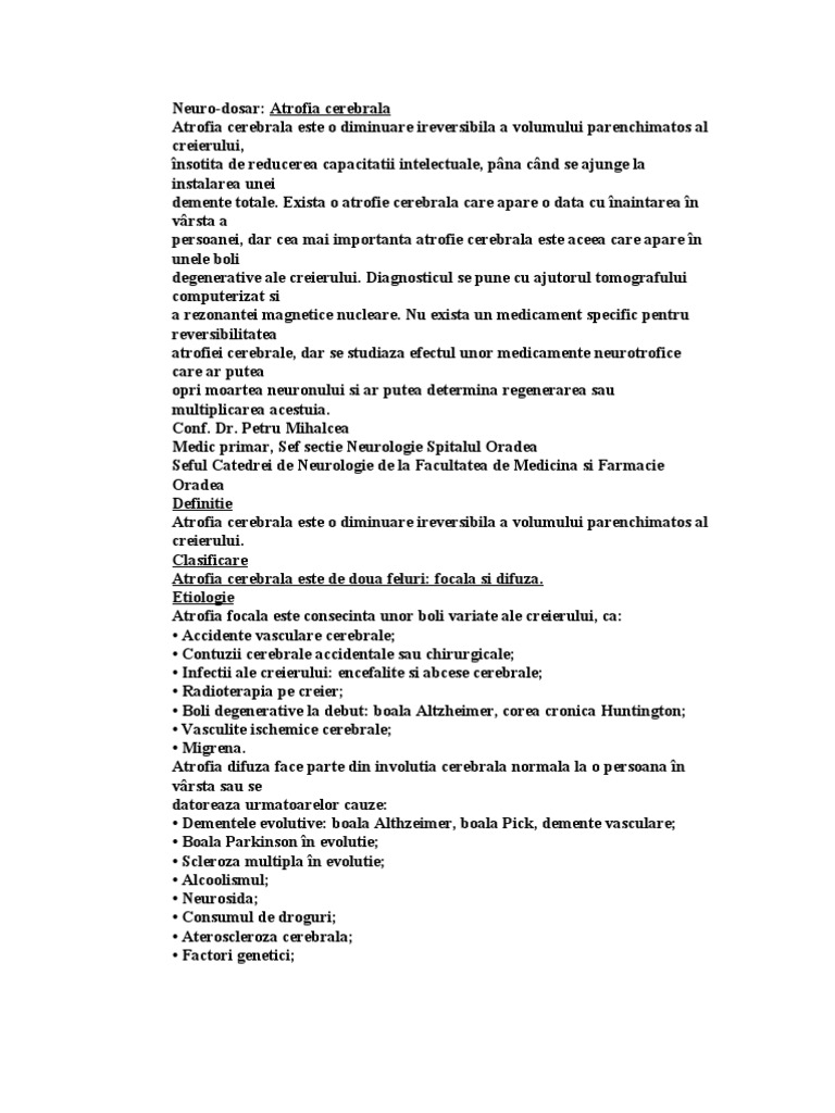 In cazul atrofiei focale sunt afectate structura si. Atrofia cerebrala denumeste orice degenerare morfologica si functionala a tesutului cerebral produsa prin distrugerea celulelor nervoase si a legaturilor neuronale. Atrofie cerebrala simptome. Cand procesul de atrofiere se generalizeaza si afecteaza toata structura cerebrala se observa si deshidratarea tesutului cerebral si reducerea in dimensiuni a acestuia.