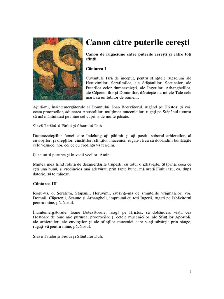 Canonul catre toate puterile ceresti. Canon catre puterile ceresti cuvinte fara de inceput pentru sfintitele rugaciuni ale heruvimilor serafimilor ale stapaniilor scaunelor ale puterilor celor dumnezeiesti ale ingerilor arhanghelilor ale capeteniilor si domniilor daruieste ne milele tale cele mari ca un iubitor de oameni. Rugăciune către toate puterile cerești 1. Este foarte folositoare să se citească şi noaptea între orele 00 00 şi 03 00 când cerurile sunt deschise iar rugăciunea ajunge direct înaintea stăpânului. Rugăciune către toate puterile cerești această rugăciune este foarte puternică şi este bine să o citească creştinul în fiecare zi.
