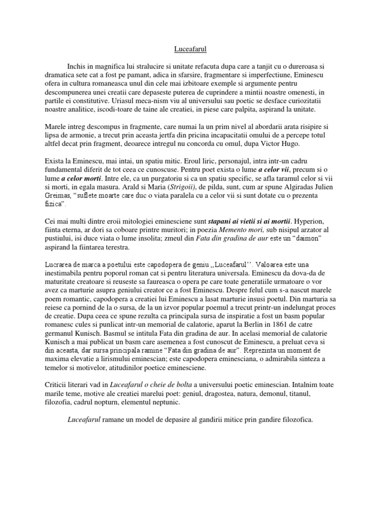 Cate strofe are luceafarul. Poezia luceafărul scrisă de mihai eminescu este considerată a fi cea mai mare capodoperă poetică românească. Desi fata pastreaza aspiratia catre planul superior o de luceafarul din cer m a prins un dor de moarte se lasa ispitita de vorbele pajului care ii arata din bob in bob amorul daca luceafarul ii oferea posibilitatea de a depasi conditia umana prin eternizarea sentimentului iubirii catalin ii propune implinirea sufleteasca imediata bazata pe compatibilitatea dintre ei hai s om fugi in. Luceafărul a fost odată ca n poveşti a fost ca niciodată. Luceafărul a 1921 opera by nicolae bretan based on eminescu s poem.