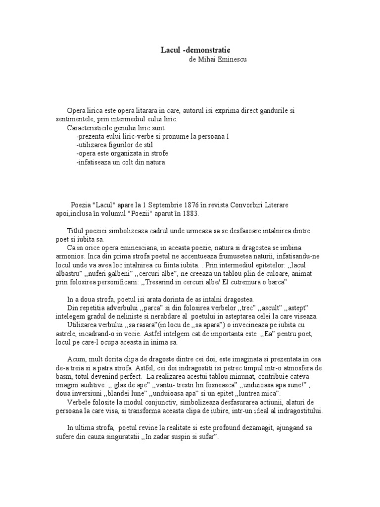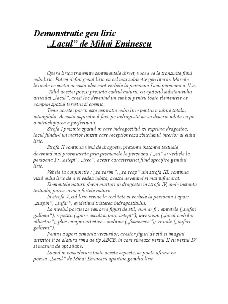 Demonstrati ca poezia lacul apartine genului liric. Genul liric cuprinde totalitatea operelor lirice care au trasaturi comune sunt scrise intotdeauna in versuri vocea poetului din text este eul liric care exprima stari si sentimente la persoana i singular cu ajutorilor figurilor de stil si imaginilor poetice. încarcat cu flori de nufar. Lacul opera lirica. Poezia lacul de mihai eminescu aparține genului liric deoarece prezintă trăsăturile acestui gen literar.