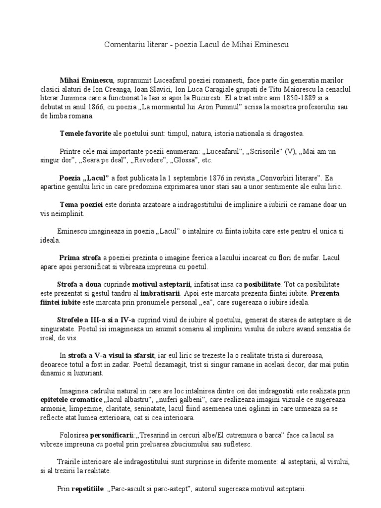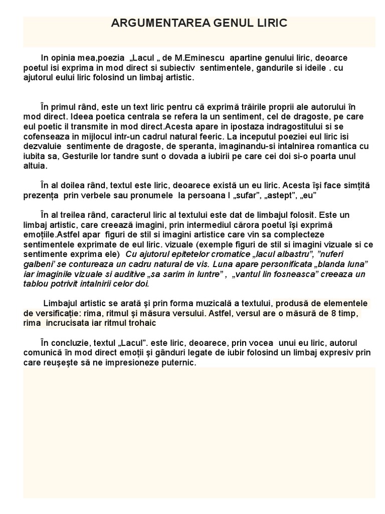 întrunind aceste trãsãturi prezenta sentimentelor si exprimarea lor directã prin intermediul unor figuri de stil prezenta eului liric poezia lacul are notele definitorii ale operelor lirice încadrându se genului literar respectiv datoritã lirismului care înseamnã tocmai dezvãluirea personalitãtii latente a lucrurilor deoarece pentru. Lânga lacul cel albastru. Demonstrati ca poezia lacul de mihai eminescu apartine genului liric 6118307.