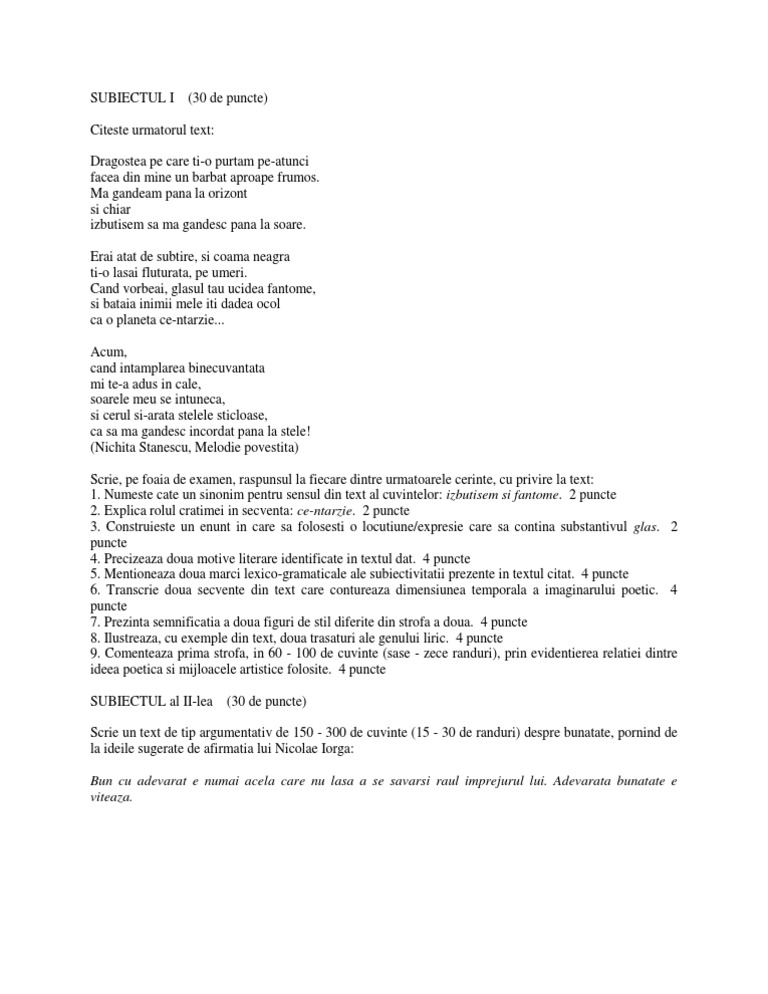 La proba scrisă la limba şi literatura română profilul real elevii au avut primit un fragment din poezia alt cântec de adrian maniu având de răspuns la nouă întrebări referitoare la elemente ale textului precum rolul cratimei elemente care conturează dimensiunea temporală a imaginarului poetic precizarea a două motive literare prezentarea semnificaţiei a două figuri. Si cand stateam in brate langa copacul verde era atat de bine ceva de genul funda. Ilustrează cu exemple din text două trăsături ale genului liric.