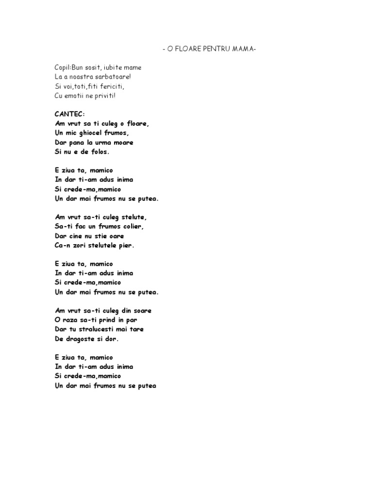Haide ti sa invatam impreuna aceste versuri e ziua ta mămico. De ziua ta mamico in dar ti am adus inima si credema mamico un dar mai frumos nu se putea 2 am vrut sa ti culeg stelute sa ti fac un frumos colier dar cine nu stie oare ca n zori stelutele pier de ziua ta mamico in dar ti am adus inima si credema mamico un dar mai frumos nu se putea. Versuri cantec e ziua ta mămico. Am vrut să ţi culeg o floare un mic ghiocel frumos dar până la urmă moare şi cui e de folos.