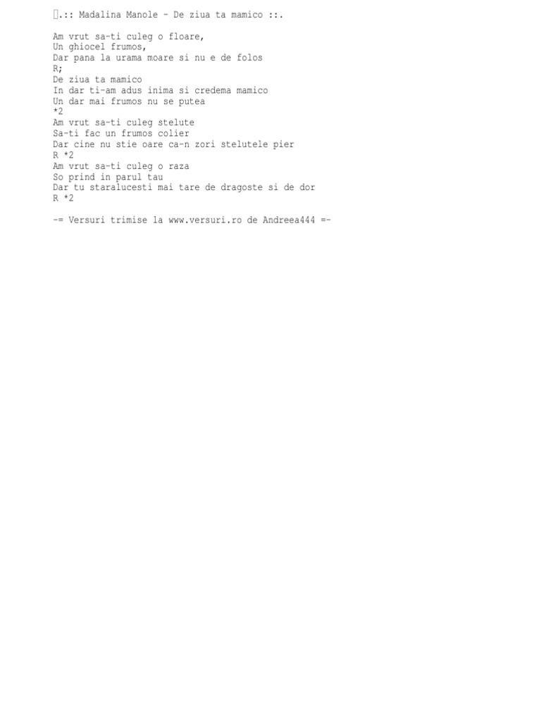 E ziua ta mamico versuri. De ziua ta mamico versuri. Dar pana la urama moare si nu e de folos r. Tralala versuri de ziua ta mamico am vrut sa ti culeg o floare un ghiocel frumos dar pana la urama moare si nu e de folos e ziua ta mamico in dar ti am adus inima si credema mamico un tralala de ziua ta mamico lyrics. De ziua ta mămico în dar ți am adus inima și crede mă mămico un dar mai frumos nu se putea.