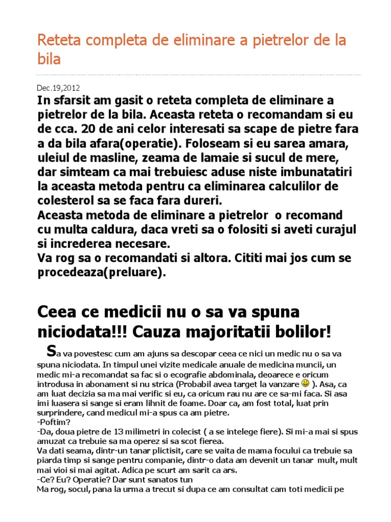 Am cautat o saptamana prin site ul revistei pe care o citesc toate babele adica formula as. Toata lumea multumea ca a scapat de pietre fara operatie dar nimeni nu dadea si reteta. Iată cum trebuie procedat pe parcusul a 6 zile pentru a scăpa de deranjantele pietre la fiere şi implicit de intervenţia chirurgicală. Există printre multe alte metode de eliminare a pietrelor la fiere un regim alimentar bazat pe pregătirea în prealabil a corpului pentru a facilita eliminarea calculilor care a fost verificat şi a dat rezultate sigure.