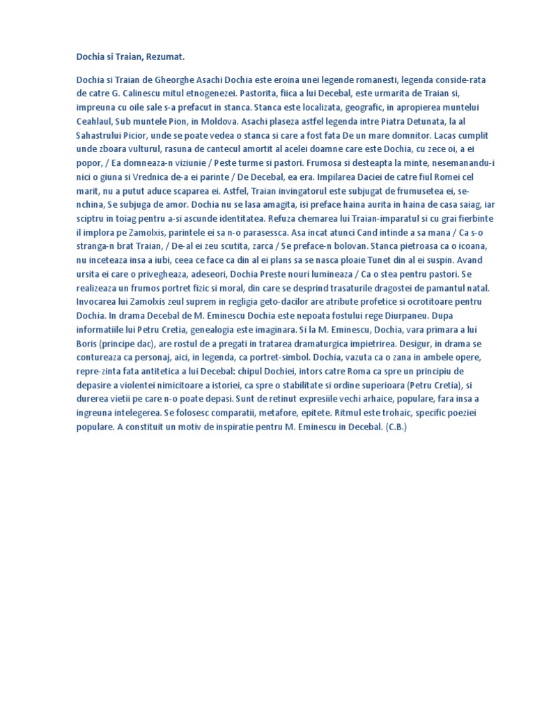 Considerată de către george călinescu mitul etnogenezei legenda populară românească dochia și traian descrie legenda dochiei fiica lui decebal care sub amenințarea romană pentru a nu își părăsi pământul și neamul se transformă alături de a ei popor în stâncă. Treceam exact prin ce treci și tu trec in clasa a 10 a sunt foarte timida nu mă înțeleg deloc cu fizica și chimia in generală eram a doua pe clasă iar acum sunt printre ultimii mă înțeleg. Cu toții am auzit câteva ceva despre povestea dochiei.