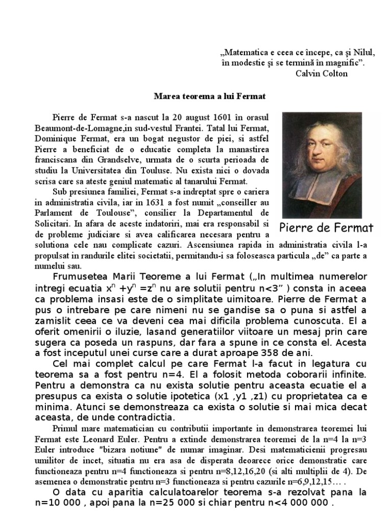 Cursuri şcoala online cursuri online primar cursuri online gimnaziu cursuri online liceu profesorul la clasă ghid practic de pedagogie resurse educaţionale interactive revista cadrelor didactice evenimente diplome pentru evenimente. Imagine marea teorema a lui fermat simon singh ed humanitas 2005 se pare că nu există soluţii pentru această ecuaţie. Marea teoremă a lui fermat este o celebră teoremă de teoria numerelor ea a fost enunțată de pierre de fermat în anul 1637 iar demonstrația completă a fost găsită de abia 357 de ani mai târziu de către matematicianul englez andrew wiles. Prima aparitie istorica a acesteia e in 1640 intr o scrisoare scrisa de matematicianul pierre de fermat catre un prieten.