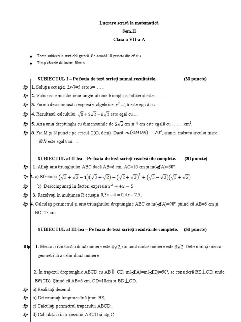 Probleme care se rezolvă prin 1 2 operaţii matematica clasa a ii a. Model 2 clasa a 6 a. Algebra geometrie clasa a vii a. Teza sem i 2016 2017.