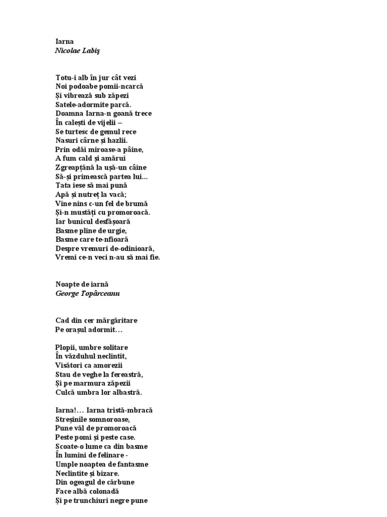 Poezii de iarna de nicolae labis. N am vazut de nicaieri o luna mai mare ca din varful muntelui inzapezit. 22 decembrie 1956 bucurești a fost un poet român. 2 decembrie 1935 poiana mărului comuna mălini județul baia în prezent județul suceava d. Unde gasesc poezii de iarna scrise de gheorge cosbuc si de nicolae labis ca n am gasit pe gogle.