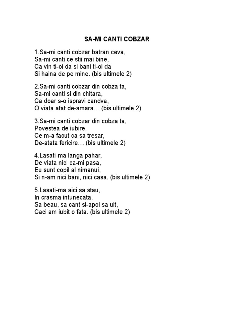 Sa mi canti cobzar batran ceva ceva ce stii mai bine ca vin. Ce m a făcut ca să tresar. Să mi cânţi cobzar bătrân ceva să mi cânţi ce ştii mai bine că vin ţi oi da şi bani ţi oi da şi haina de pe mine. Bis ultimele 2 sa mi canti cobzar din cobza ta sa mi canti si din chitara ca doar s o ispravi candva o viata atat de amara bis ultimele 2 sa mi canti cobzar.