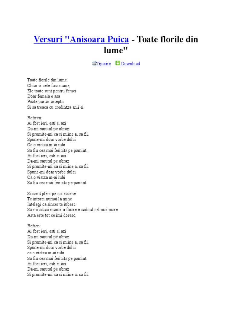 Tu ești sfânt iubite domn 2. Tu ești crinul cel din vale trandafirul din saron tu ești mugurul din floare. Pentru baiatul mic si prost care iese pentru prima oara in lume orice san sau fesa mai proeminente reprezinta frumusetea intruchipata iar sangele semi coagulat se duce din creier direct in celalalt creier mai uzual si anume penis. Versuri anisoara puica toate florile din lume tiparire trimite prin y m twitter facebook download toate florile din lume chiar si cele fara nume ele toate sunt pentru femei doar femeia e asa poate pururi astepta si sa treaca cu credintza anii ei refrren.
