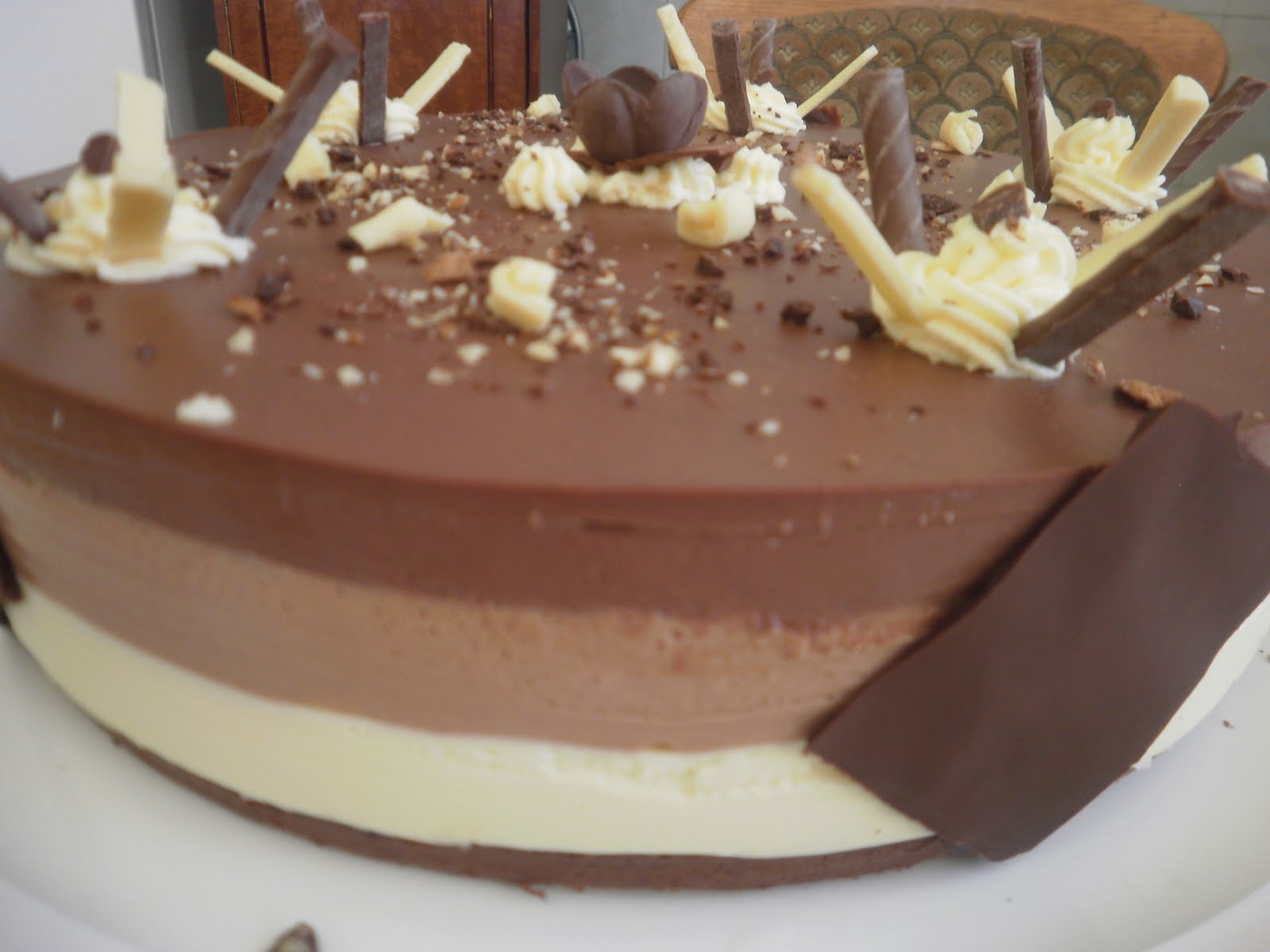 Este primul tort de acest gen si am avut ghinionul sa luam o gelatina proasta care nu s a intarit nici in paharul cu apa si una peste alta l am bagat si incongelator l am imbracat in frisca sa nu se mai vada ca au gazut bucati din el am pus niste floricele din napolitana si cateva bucle de ciocolata. Tort cu trei feluri de ciocolata. Cum ea este o ciocolatoasa inraita ca si mine de altfel p am pregatit acest minunat tort cu 3 feluri de ciocolata. Retete culinare in poze explicate pas cu pas.